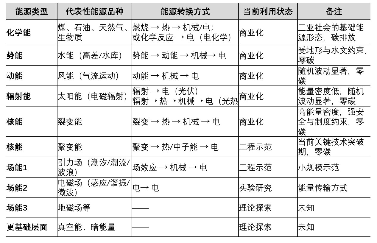 不同的能源形态,塑造了不同的技术路径、产业结构与文明形态。从物理形态来看,人类已经广泛利用的能源品种有: