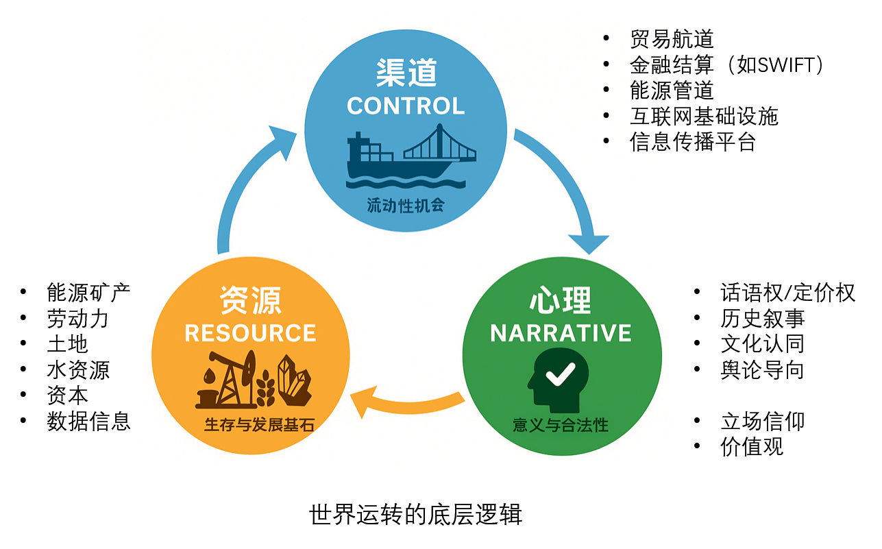 真正的强大,并不取决于拥有多少资源,而在于是否同时掌握资源本身、关键渠道/通道的控制能力,以及叙事与规则制定的话语权;当资源、渠道与叙事形成闭环,资源才从可消耗的属性,转化为持续塑造掌控格局的能力。